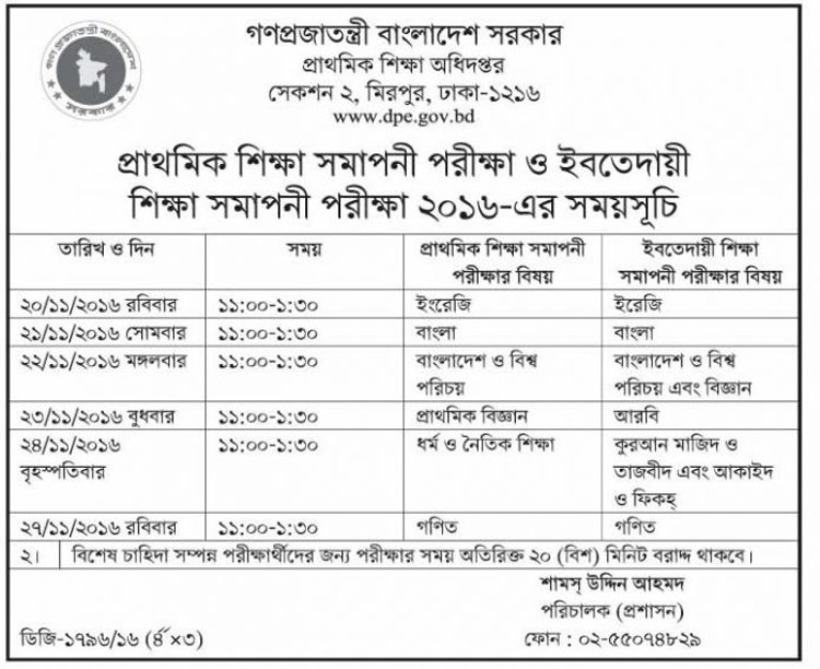 প্রাথমিক ও ইবতেদায়ী শিক্ষা সমাপনী পরীক্ষা ২০১৬-এর সময়সূচি প্রকাশ করেছে প্রাথমিক শিক্ষা অধিদফতর। এ বছর সমাপনী পরীক্ষা ২০ নভেম্বর শুরু হয়ে ২৭ নভেম্বর শেষ হবে।