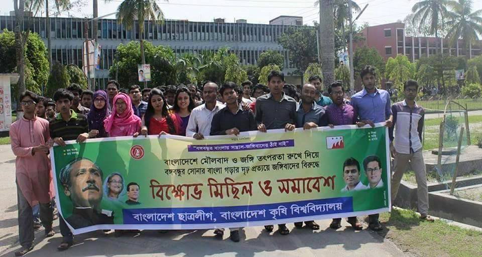 বাংলাদেশ কৃষি বিশ্ববিদ্যালয়ে (বাকৃবি) জঙ্গিবাদের বিরুদ্ধে বিক্ষোভ মিছিল ও সমাবেশ করেছে বাকৃবি শাখা ছাত্রলীগ।