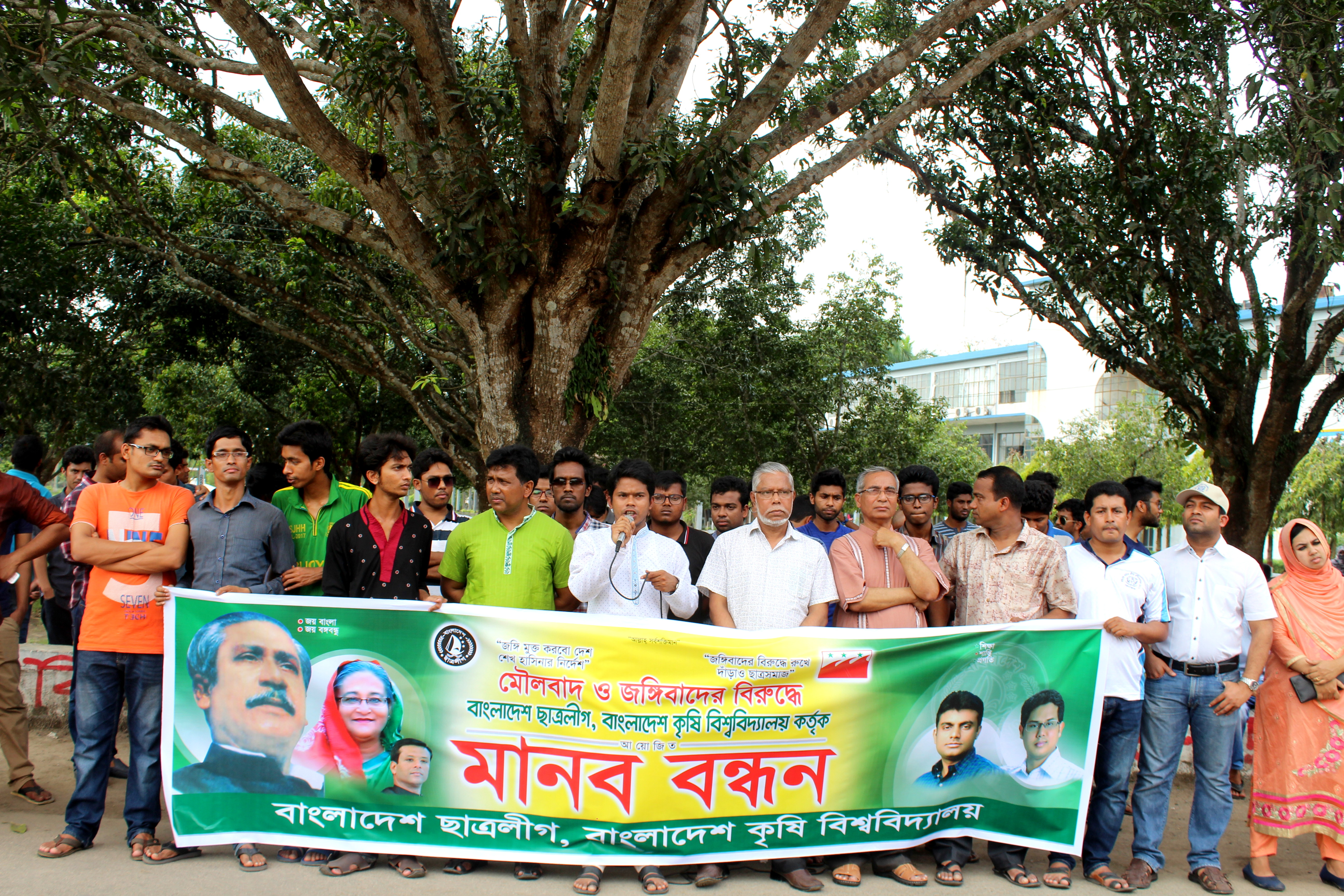 ‘জঙ্গি মুক্ত করবো দেশ, শেখ হাসিনার নির্দেশ’ , জঙ্গিবাদের বিরুদ্ধে রুখে দাঁড়াও ছাত্রসমাজ’ এ শ্লোগানকে সামনে রেখে মৌলবাদ ও জঙ্গিবাদের বিরুদ্ধে মানববন্ধন করেছে বাংলাদেশ কৃষি বিশ্ববিদ্যালয় (বাকৃবি) শাখা ছাত্রলীগ।
