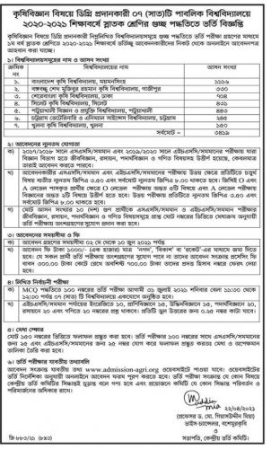 ২০২০-২০২১ শিক্ষাবর্ষে ৭ কৃষি বিশ্ববিদ্যালয়ের গুচ্ছ ভর্তি বিজ্ঞপ্তি প্রকাশিত হয়েছে। কৃষি বিজ্ঞান বিষয়ে ডিগ্রি প্রদানকারী ৭টি পাবলিক বিশ্ববিদ্যালয়ে স্নাতক শ্রেণিতে চলতি শিক্ষাবর্ষে আসন আছে মোট ৩৪১৯টি।