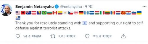 ২৫টি দেশের পতাকা প্রকাশ করে নেতানিয়াহু লেখেন ইসরায়েলের পক্ষে দাঁড়িয়ে সন্ত্রাসী হামলার বিরুদ্ধে আমাদের আত্মরক্ষার অধিকারকে সমর্থন করার জন্য আপনাদের ধন্যবাদ। নেতানিয়াহুর প্রকাশ করা বিভিন্ন দেশের পতাকাগুলো মধ্যে এক নম্বরে রয়েছে যুক্তরাষ্ট্র এবং ৬ নম্বরে রয়েছে ব্রাজিল।