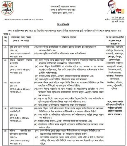 নিউজ ডেস্কঃ মৎস্য ও প্রাণিসম্পদ তথ্য দপ্তর কিছু শূন্য পদসমূহ পূরণের জন্য স্থায়ী বাংলাদেশি নাগরিকদের কাছ থেকে দরখাস্ত আহ্বান করেছে। আগ্রহী প্রার্থীরা যোগ্যতা থাকলে সরাসরি অফিস বরাবর আগামী ২১ এপ্রিল পর্যন্ত আবেদন করতে পারবেন।