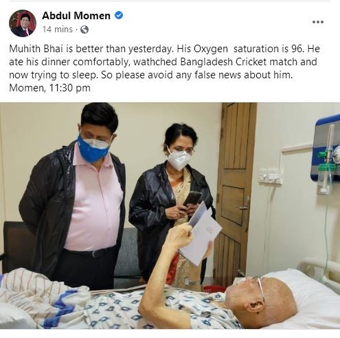 নিউজ ডেস্কঃ করোনাভাইরাসে আক্রান্ত সাবেক অর্থমন্ত্রী ও আওয়ামী লীগের উপদেষ্টা পরিষদের সদস্য আবুল মাল আবদুল মুহিতের মৃত্যুর গুজব ছড়িয়ে পরেছে ফেসবুকে। তবে তার শারীরিক অবস্থার অনেকটাই উন্নতি হয়েছে বলে জানিয়েছেন মুহিতের ছোট ভাই ও পররাষ্ট্রমন্ত্রী এ কে আব্দুল মোমেন।