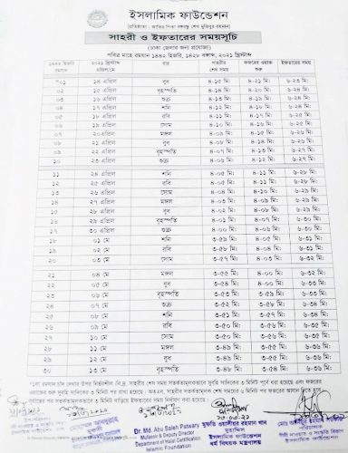 রোববার (২১ মার্চ) গণমাধ্যমে এ চিঠি পাঠিয়েছে ইসলামিক ফাউন্ডেশন। গত ১৩ মার্চ ইসলামিক ফাউন্ডেশন ১৪৪২ হিজরির রমজান মাসের সেহরি ও ইফতারের এ সময়সূচি চূড়ান্ত করে।